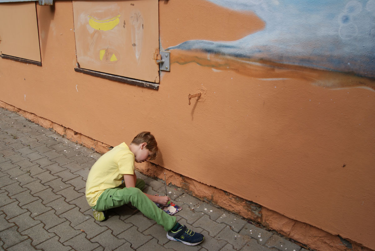 Aus der Projektbeschreibung: Aschersleben ist eine schöne und interessante Stadt. Zuerst laufen wir mit einem Skizzenblock durch die Stadt. Schauen und zeichnen Häuser, Plätze, Menschen. Dabei steigen wir zum Beispiel auf einen Turm, gehen ins Gefängnis, in eine Kirche und an unbekannte Orte. Dann gehen wir in das Atelier und wählen ein Motiv aus unseren Skizzen aus. Nun werden die Farben ausgepackt, die Leinwand wird auf die Staffelei gestellt und los geht es mit der Malerei.