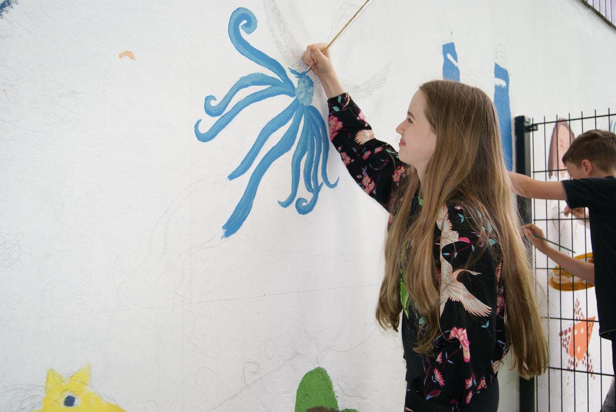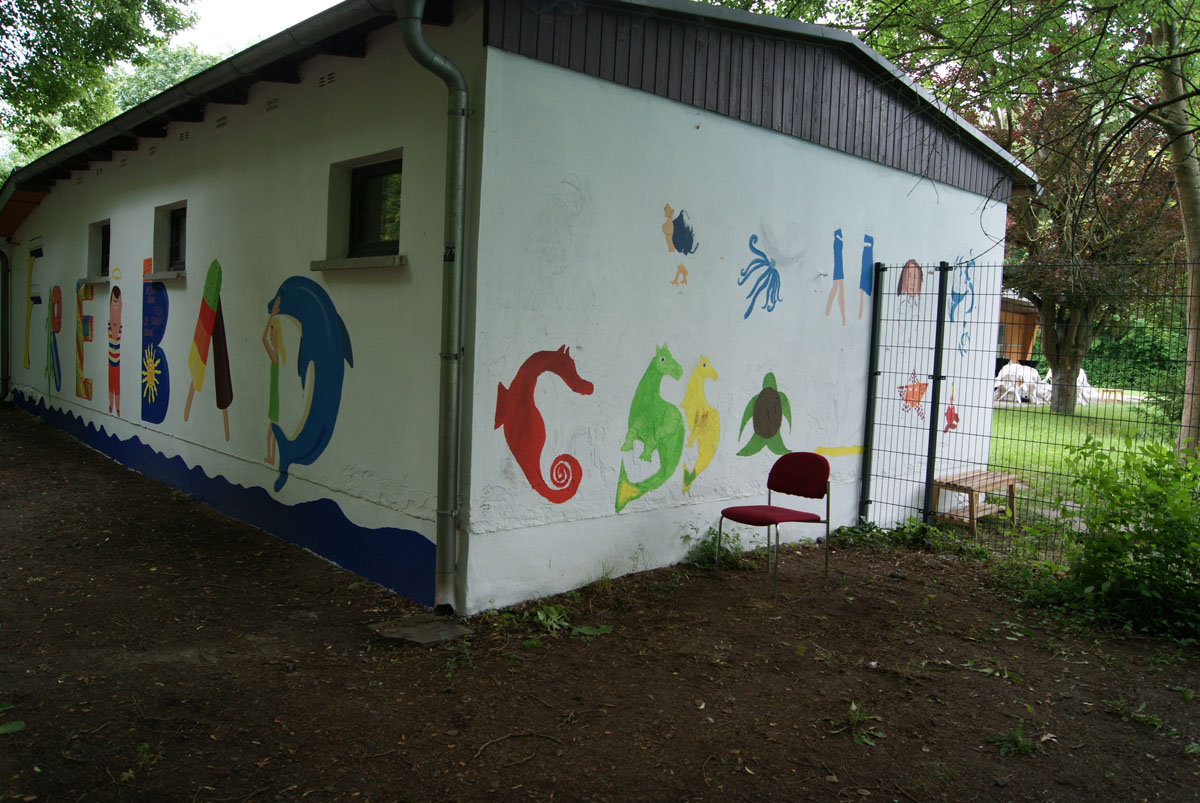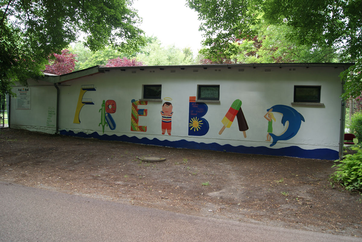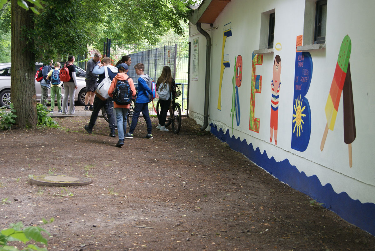 In dieser Projektwoche werden wir eine besondere Aufgabe übernehmen. In Absprache mit der OptimAL GmbH werden wir im Freibad Aschersleben unter der Burg weitere Wände mit einem großen Bild gestalten. Wir setzen damit die Arbeit der Berufsschüler fort, welche im Mai bereits ein erstes Wandbild gestaltet haben. Hier sind Bilder von den Arbeiten am Wandbild in unserem Freibad: