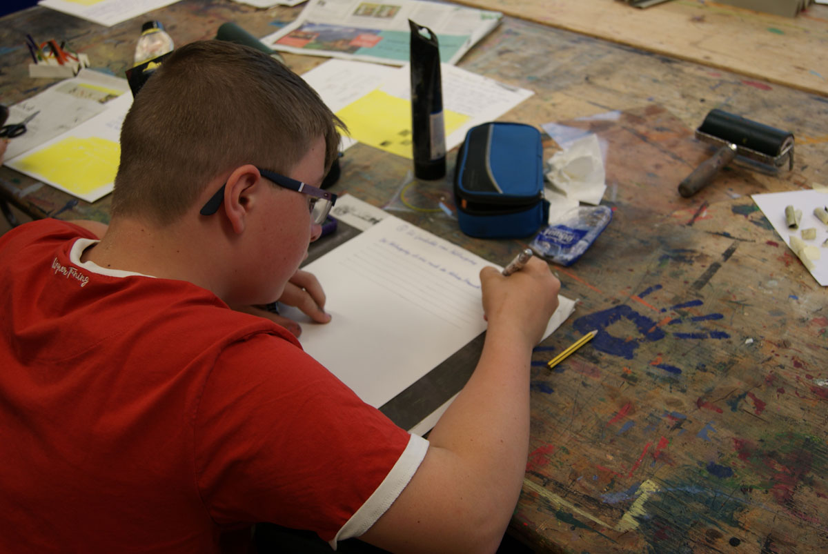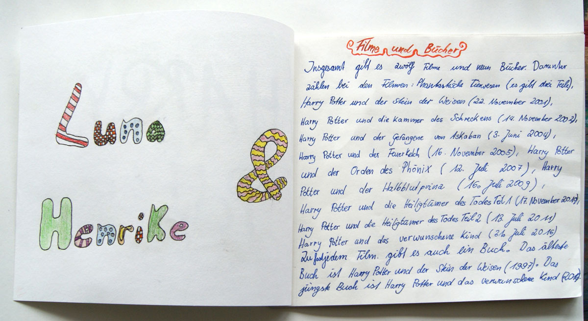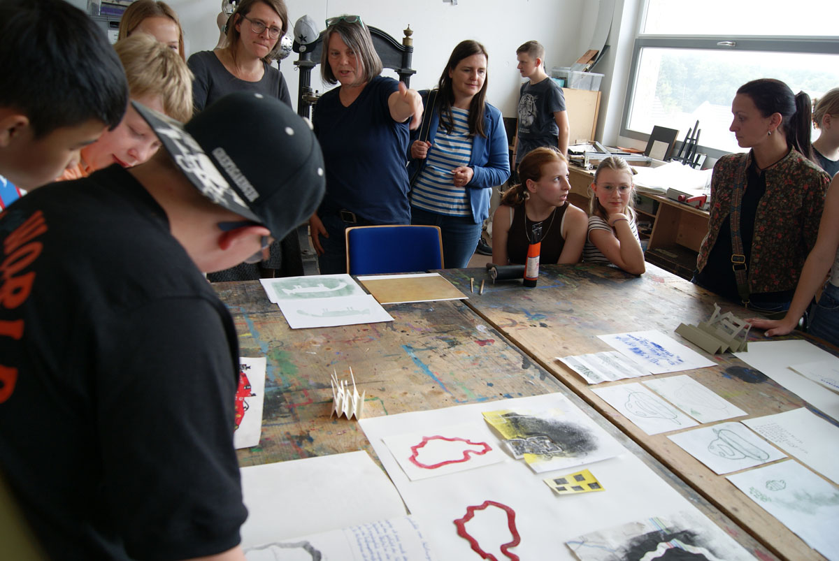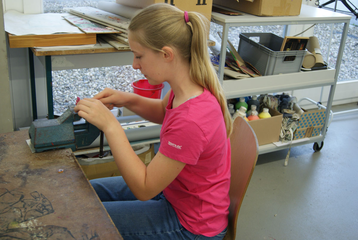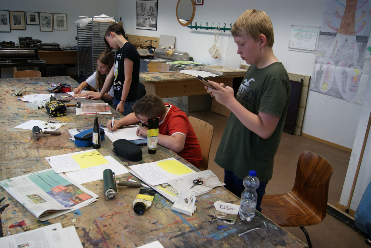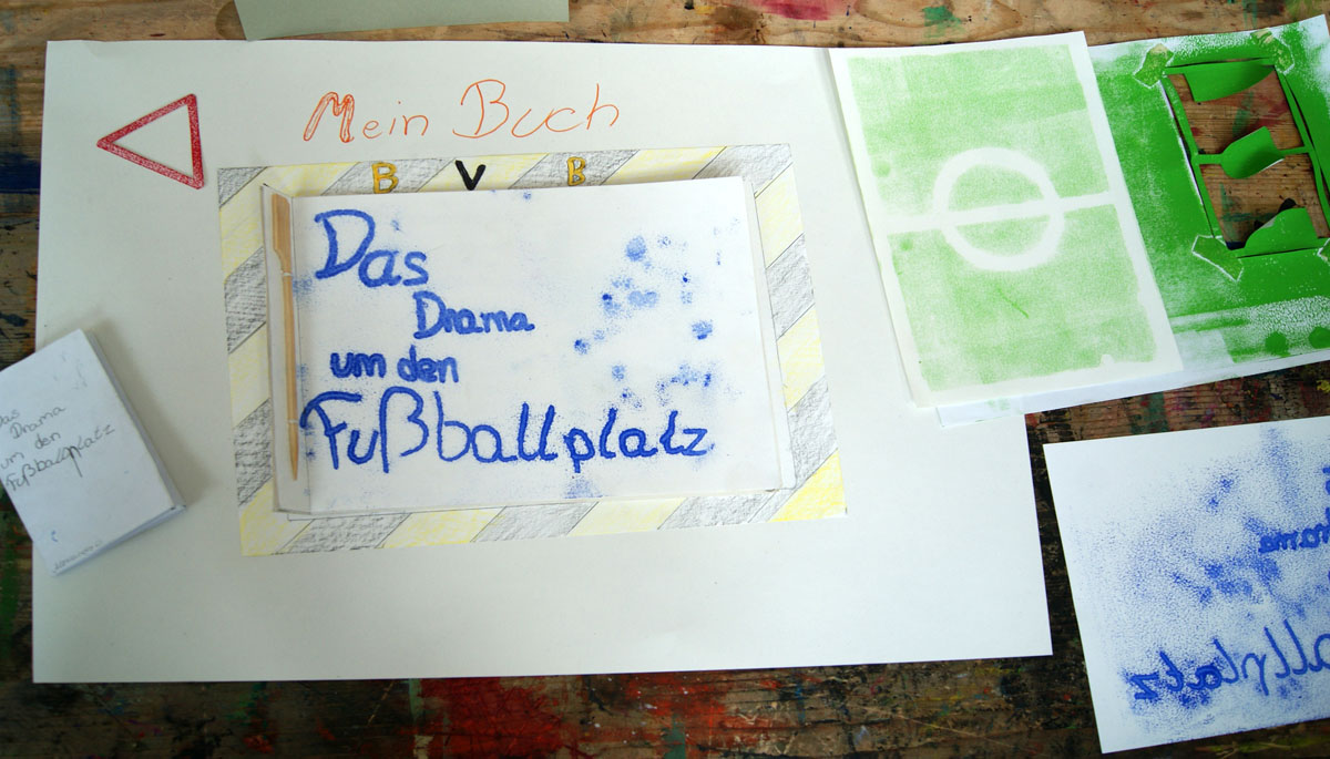 Projektbeschreibung: In der Projektwoche möchte ich mit euch ein Künstlerbuch gestalten und herstellen. Durch Gedichte und Kurzgeschichten, die wir gemeinsam entdecken, finden wir die Ideen für euer Künstlerbuch. Vielleicht schreibt sogar jemand selbst einen Text! Die Buchseiten und den Umschlag gestalten wir mit einer grafischen Technik (z.B. Zeichnung, Collage, Monotypie, Materialdruck). Um die Schrift ins Buch zu bringen, stehen euch verschiedene Schriftstempel zur Verfügung. Am Ende der Woche fügen wir die von euch gestalteten Buchseiten in Form eines Heftes oder eines Leporellos zusammen.