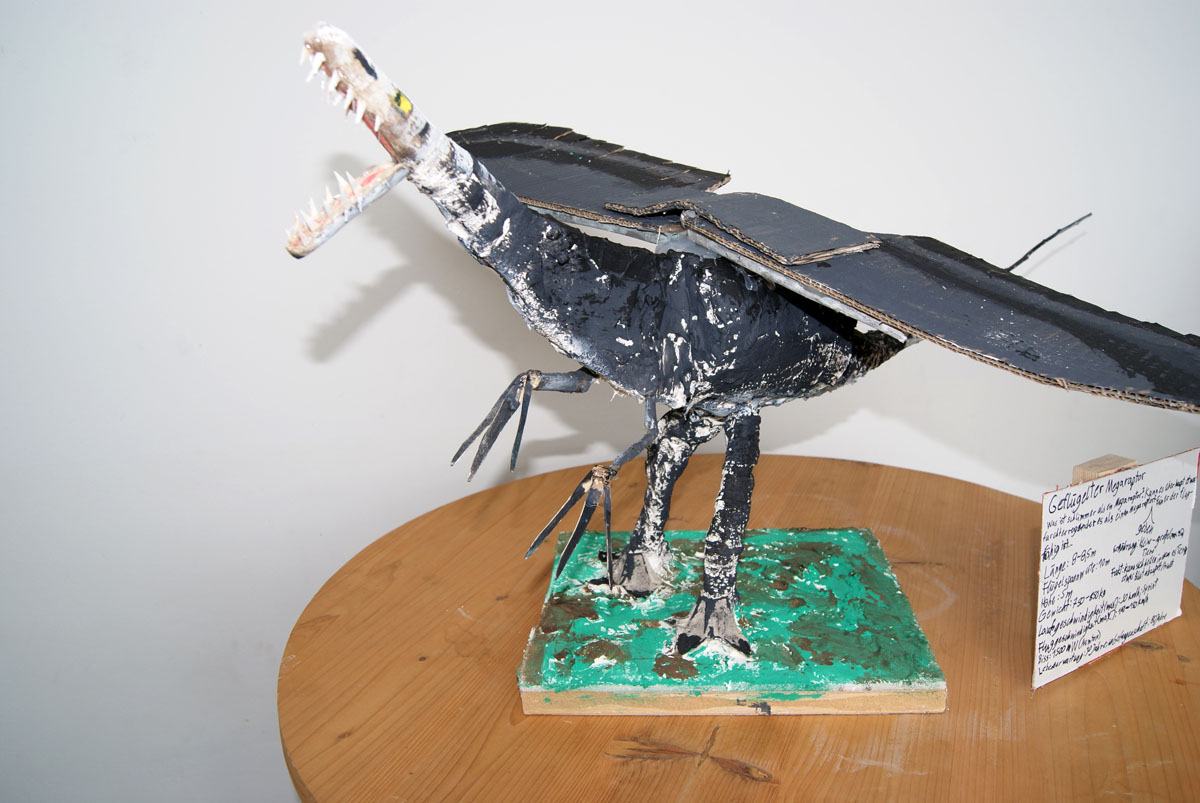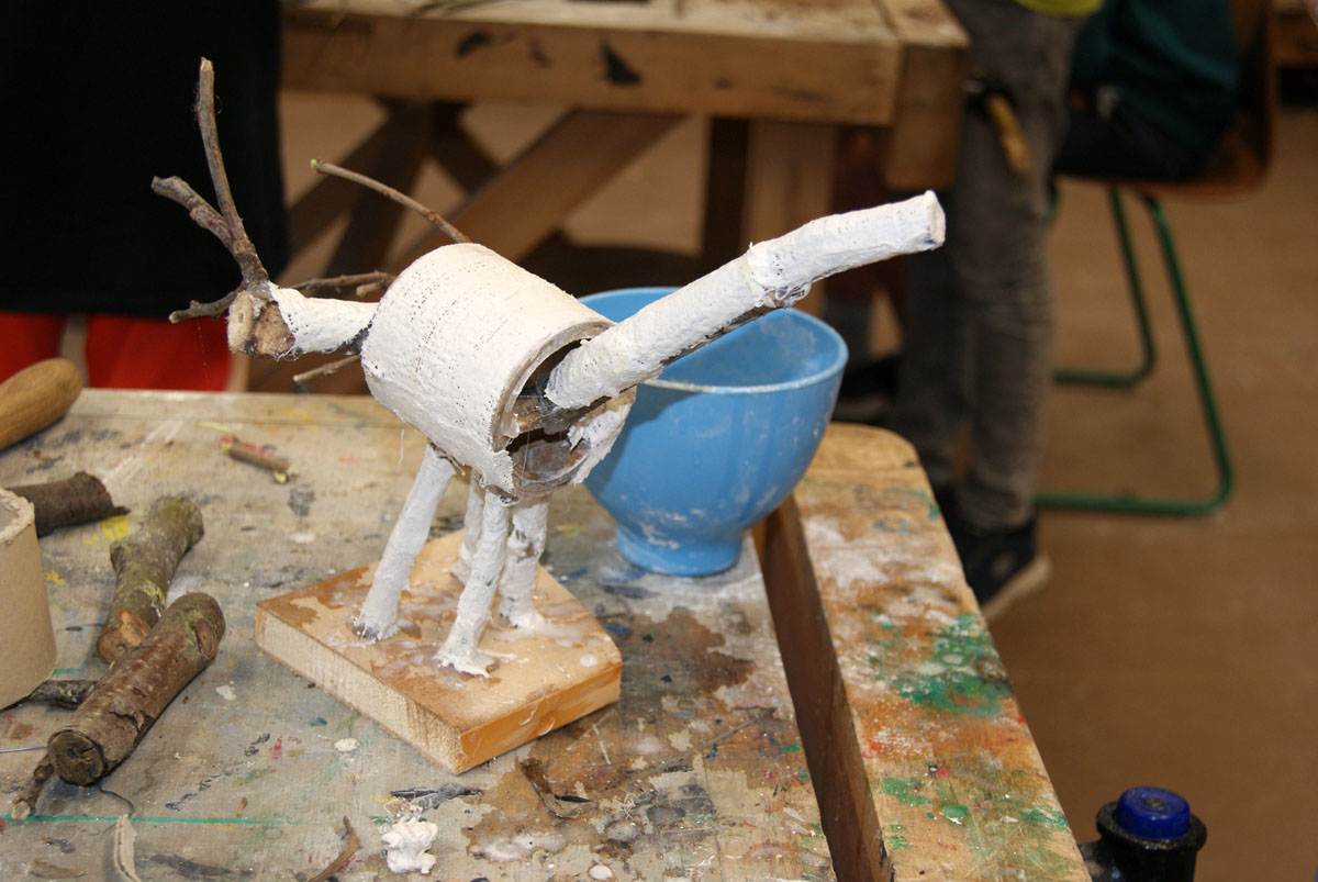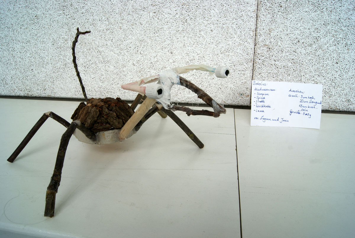 Projektbeschreibung: Thematisch beschäftigen wir uns in dieser Woche mit dem Thema „Mischwesen“. In der Evolutionsgeschichte gibt es Lebewesen, die einen Übergang von einer Art zu einer anderen bilden. Sie weisen Merkmale verschiedener Tiergruppen auf. Sie werden Brückentiere oder auch Mosaikform genannt. Auch in Geschichten gibt es Fabelwesen, Hybride oder Chimären. Sie sind zusammengesetzt aus verschiedenen Formen und Merkmalen. Wir bauen aus Naturmaterialien, Fundstücken, Müll, Draht, Papier und Gips plastische Mischwesen.