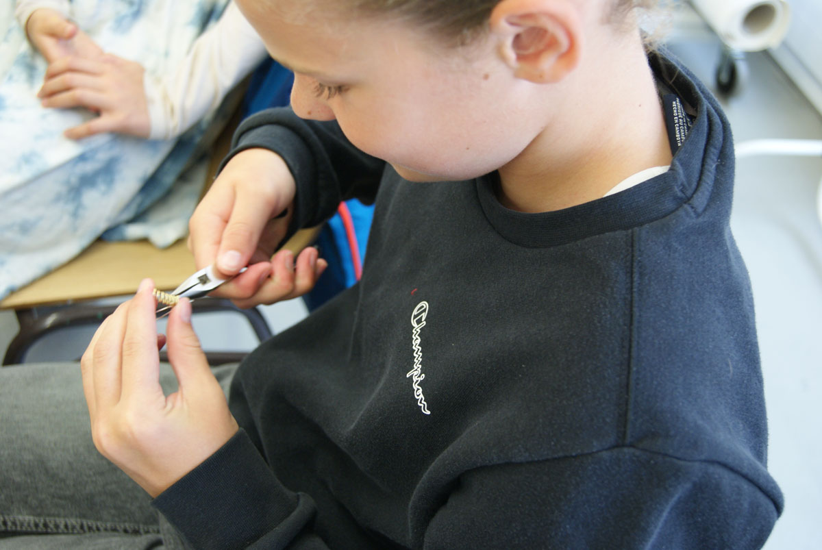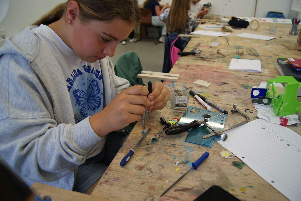Projektbeschreibung: In dieser Woche beschäftigen wir uns mit dem Lächeln und dem Lachen. Es gibt so viele ernste Themen um uns herum, so dass wir versuchen wollen, etwas mehr Lachen in die Welt zu bringen. Was bringt dich zum Lachen? Welche Erinnerung zaubert dir ein Lächeln ins Gesicht? Zu diesem Thema werden zunächst Skizzen gezeichnet und Modelle aus Papier angefertigt. Die Schmuckstücke selber werden aus Aluminiumblech und Draht mit goldschmiedischen Grundtechniken, wie Sägen, Feilen und Biegen, hergestellt. Ihr erlernt diese Techniken anhand einfacher Übungen, damit ihr dann eure eigenen Entwürfe umsetzen könnt. In der Schmuckwerkstatt sind handwerkliches Geschick, Geduld und Ideenreichtum gefragt. Unsere Materialien und Werkzeuge werden im Wesentlichen sein: Metallblech und -draht, Papier, Dekomaterialien wie z.B. Perlen, Schnur, Säge, Zangen, Feilen, Bohrmaschine u.v. Wir werden kreativ arbeiten mit Blech und Draht zum Thema „Lächeln“.