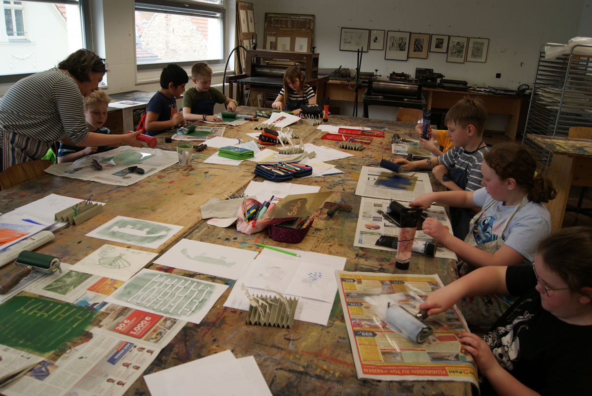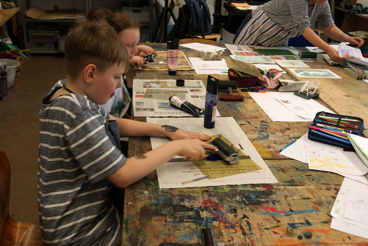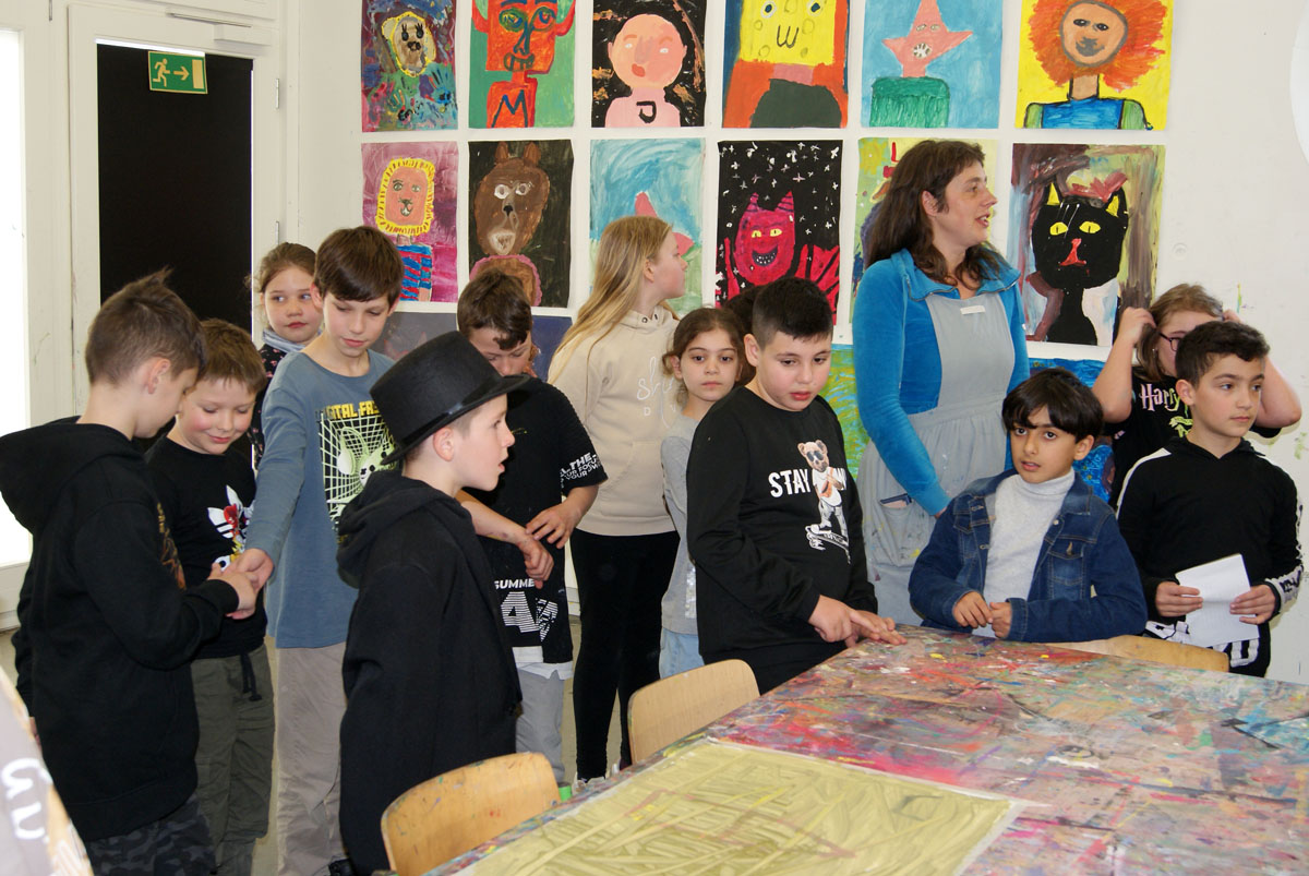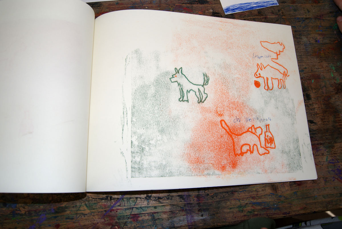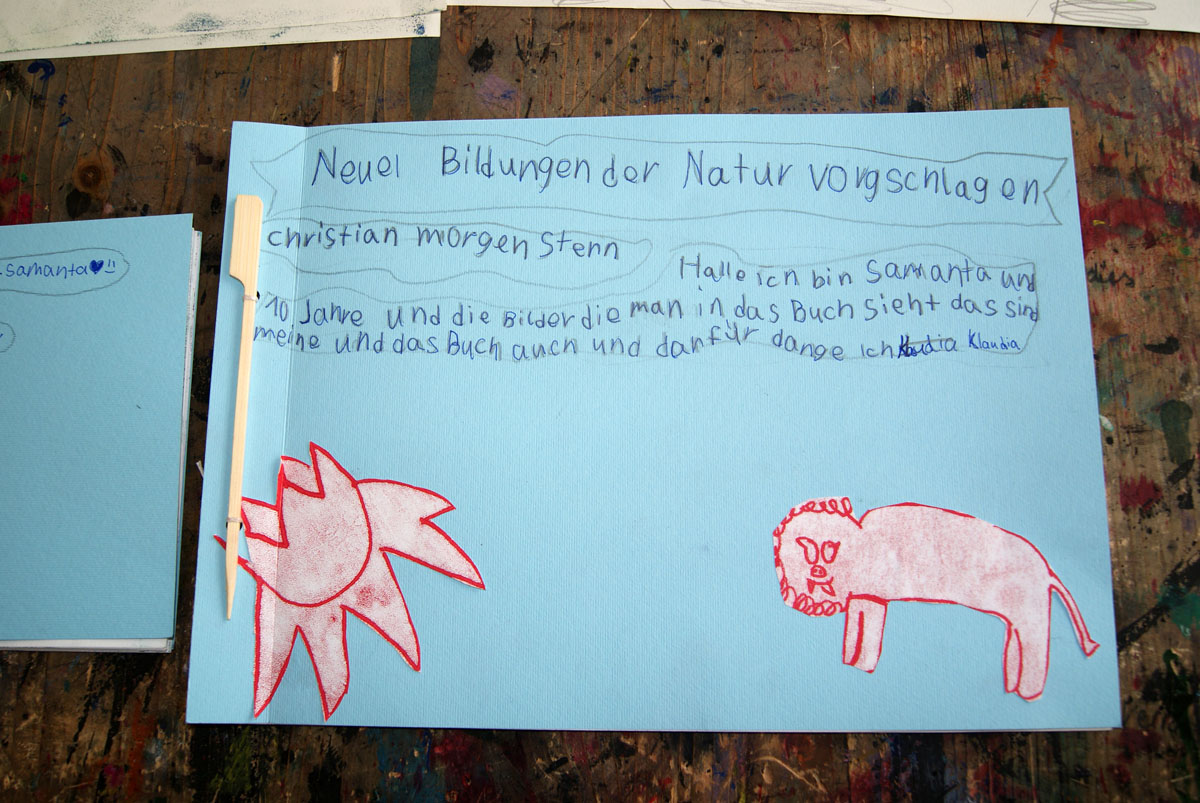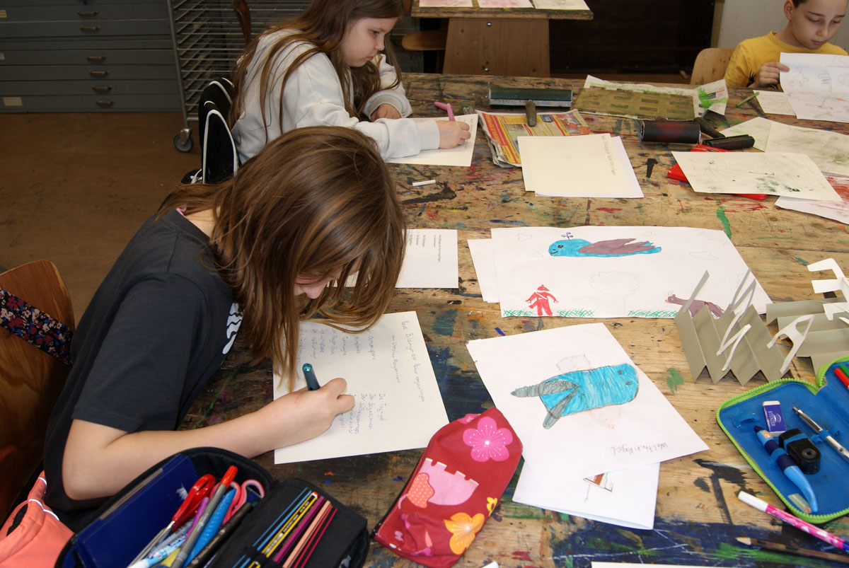 Aus der Projektbeschreiubung: In der Projektwoche möchte ich mit euch ein Künstlerbuch gestalten und herstellen. Durch Gedichte und Kurzgeschichten, die wir gemeinsam entdecken, finden wir die Ideen für euer Künstlerbuch. Vielleicht schreibt sogar jemand selbst einen Text! Die Buchseiten und den Umschlag gestalten wir mit einer grafischen Technik (z.B. Zeichnung, Collage, Monotypie, Materialdruck). Um die Schrift ins Buch zu bringen, stehen euch verschiedene Schriftstempel zur Verfügung. Am Ende der Woche fügen wir die von euch gestalteten Buchseiten in Form eines Heftes oder eines Leporellos zusammen.