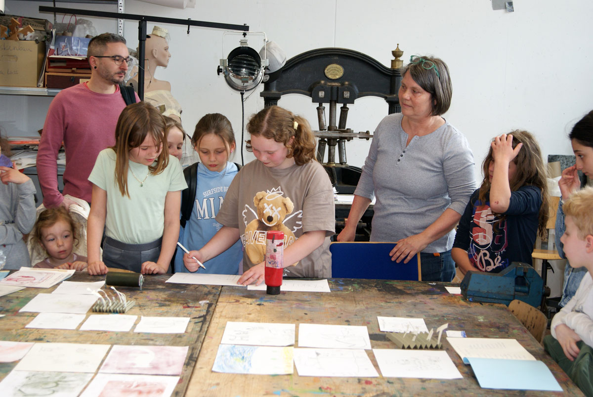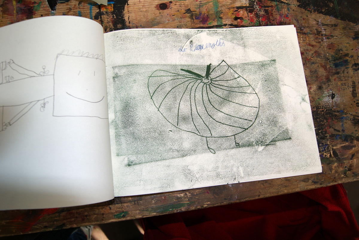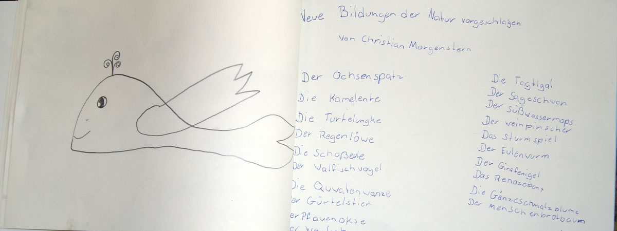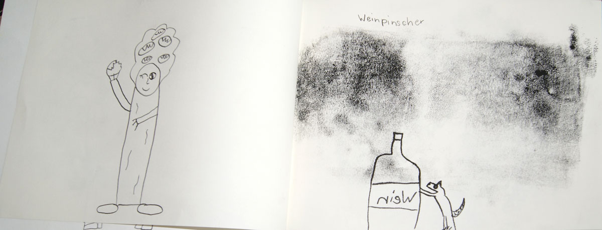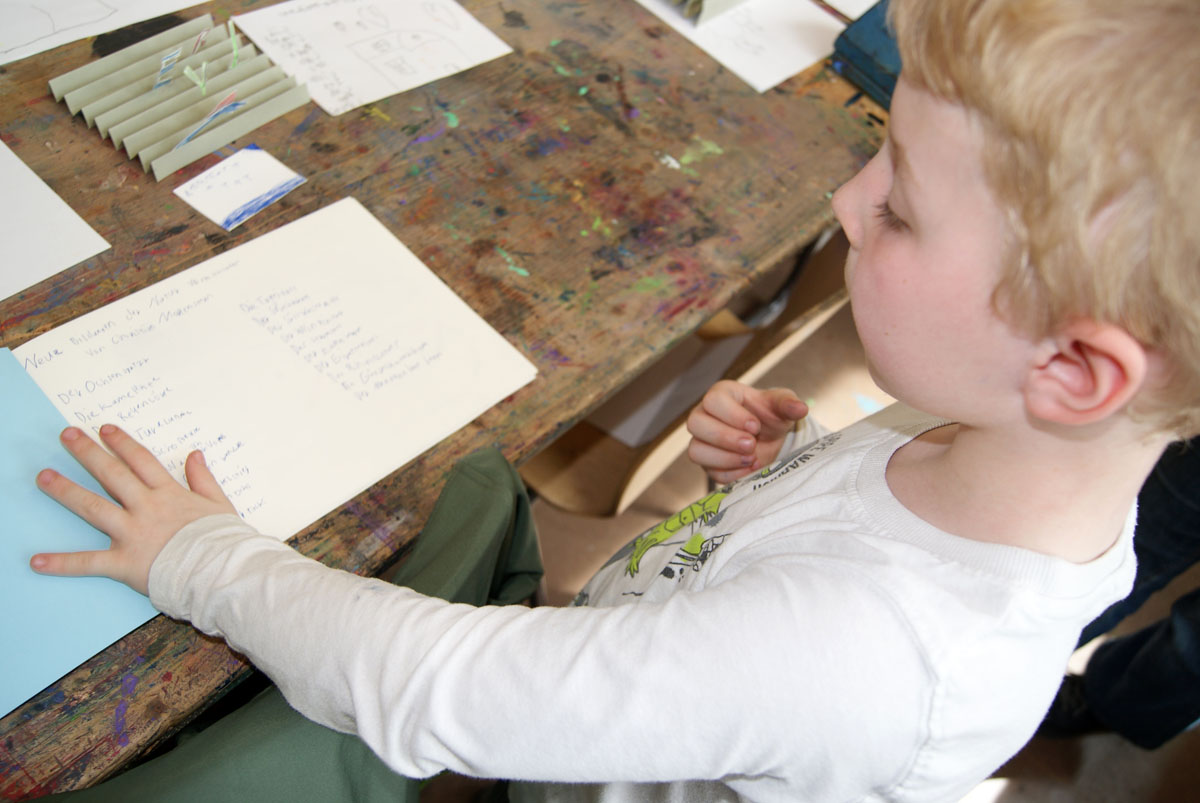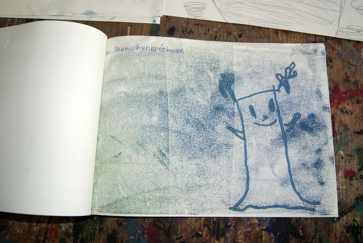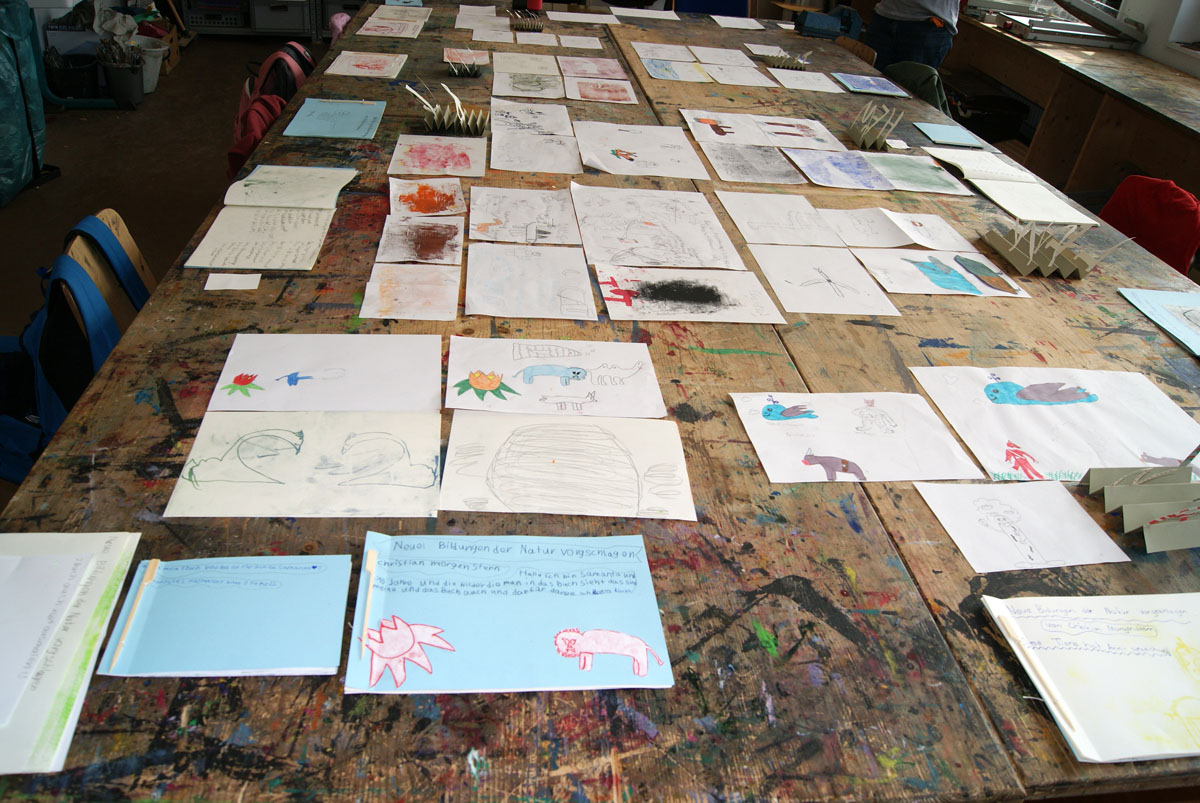 Aus der Projektbeschreiubung: In der Projektwoche möchte ich mit euch ein Künstlerbuch gestalten und herstellen. Durch Gedichte und Kurzgeschichten, die wir gemeinsam entdecken, finden wir die Ideen für euer Künstlerbuch. Vielleicht schreibt sogar jemand selbst einen Text! Die Buchseiten und den Umschlag gestalten wir mit einer grafischen Technik (z.B. Zeichnung, Collage, Monotypie, Materialdruck). Um die Schrift ins Buch zu bringen, stehen euch verschiedene Schriftstempel zur Verfügung. Am Ende der Woche fügen wir die von euch gestalteten Buchseiten in Form eines Heftes oder eines Leporellos zusammen.