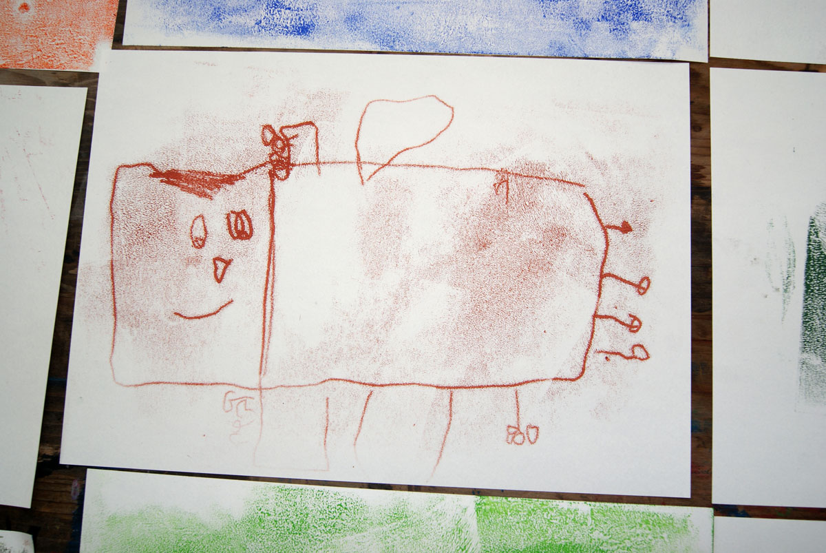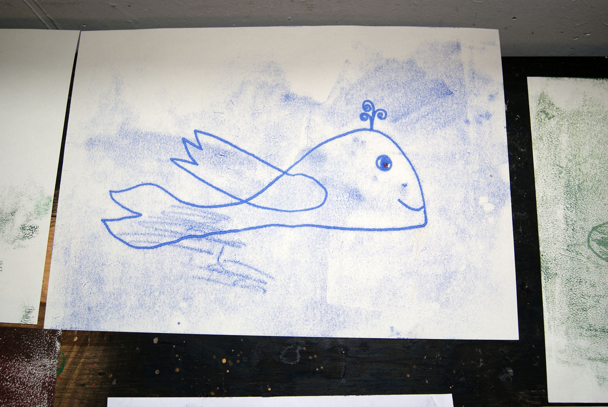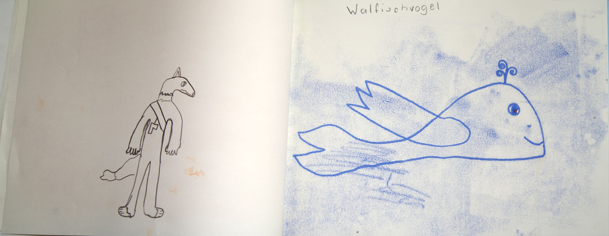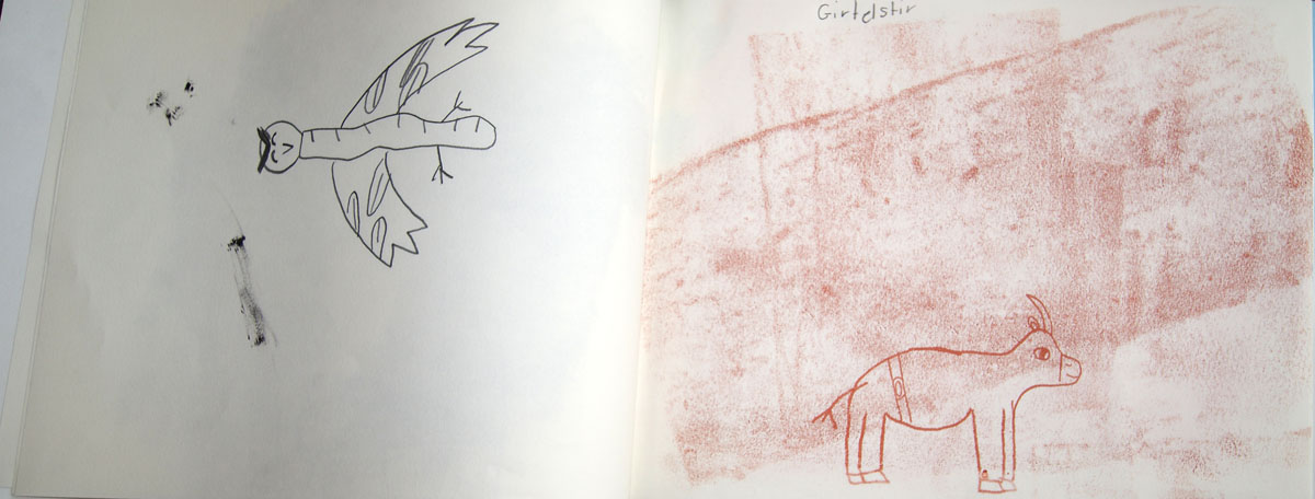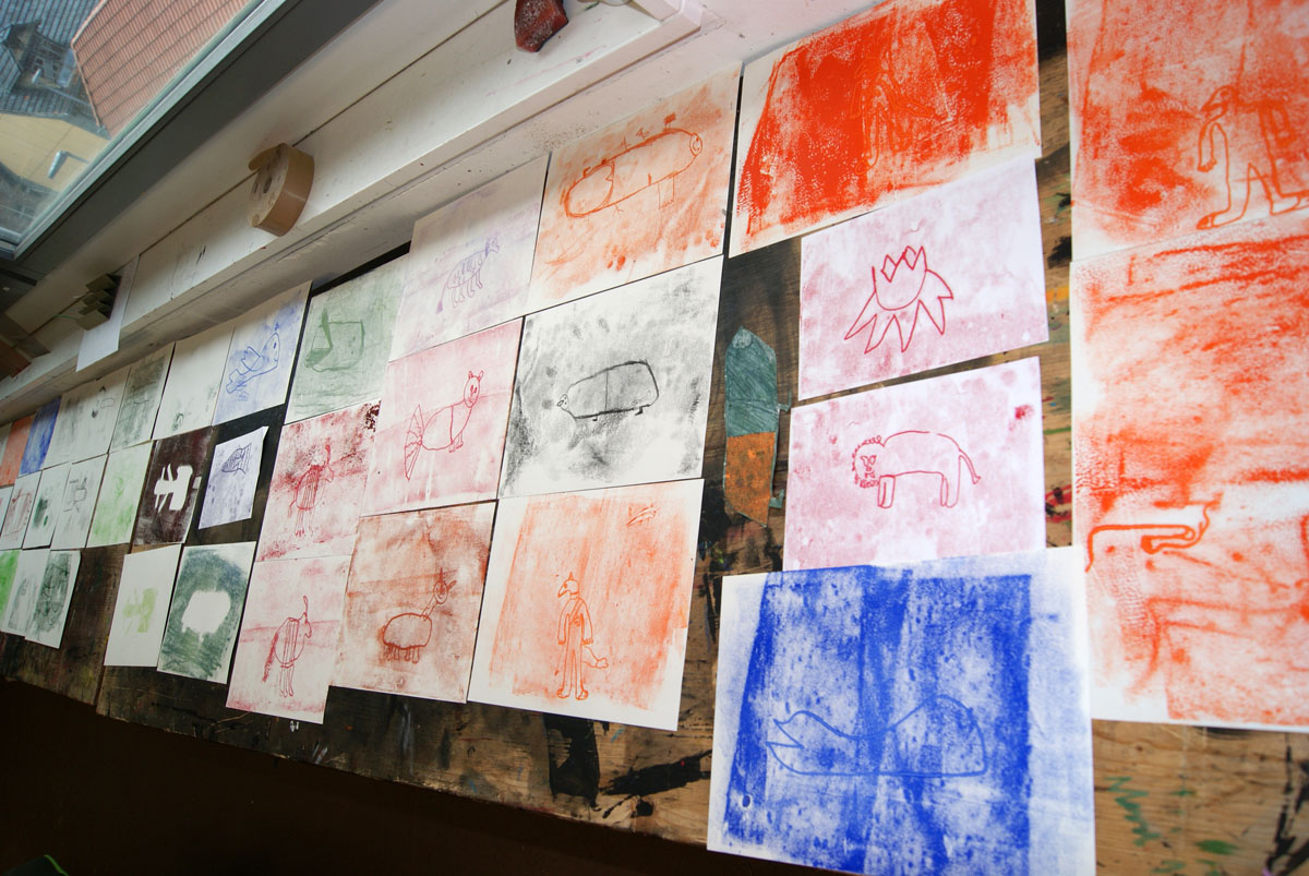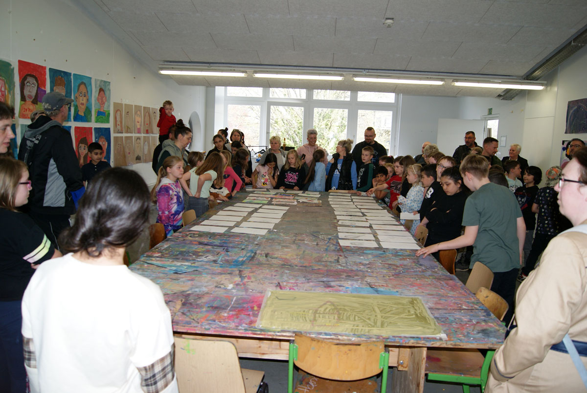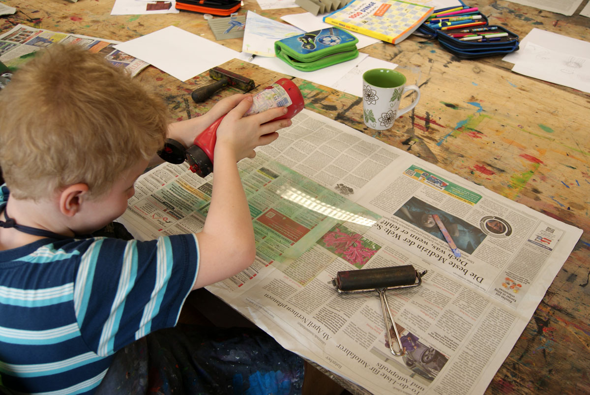 Aus der Projektbeschreiubung: In der Projektwoche möchte ich mit euch ein Künstlerbuch gestalten und herstellen. Durch Gedichte und Kurzgeschichten, die wir gemeinsam entdecken, finden wir die Ideen für euer Künstlerbuch. Vielleicht schreibt sogar jemand selbst einen Text! Die Buchseiten und den Umschlag gestalten wir mit einer grafischen Technik (z.B. Zeichnung, Collage, Monotypie, Materialdruck). Um die Schrift ins Buch zu bringen, stehen euch verschiedene Schriftstempel zur Verfügung. Am Ende der Woche fügen wir die von euch gestalteten Buchseiten in Form eines Heftes oder eines Leporellos zusammen.