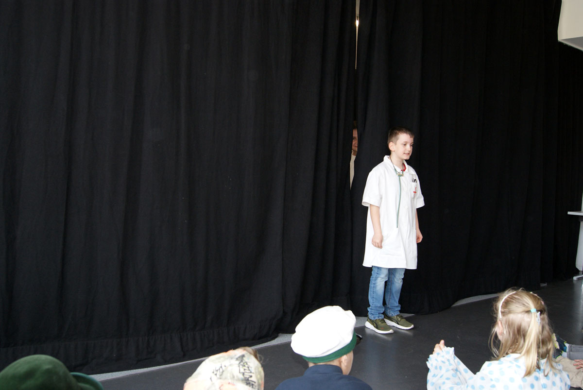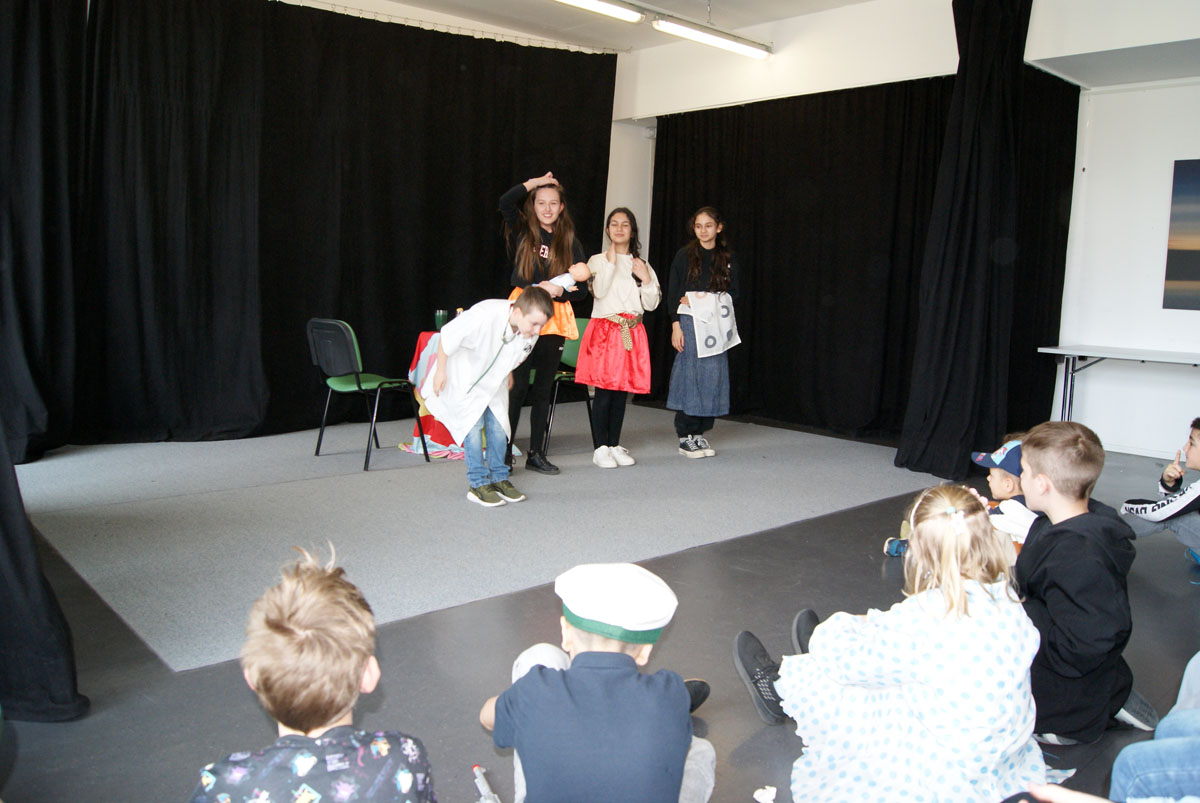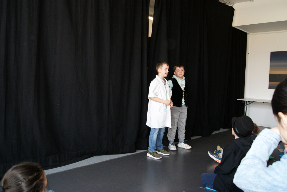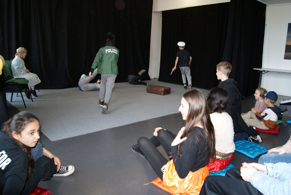 Aus der Projektbeschreibung: Willkommen im Theater! Hier musst du keinen Text lernen, um auf der Bühne zu stehen! Wenn ihr Lust habt, in andere Rollen zu schlüpfen, euch gern auf etwas Neues einlassen wollt, euch gern verkleidet und einfach Spaß daran habt im Spiel kleine Szenen entstehen zu lassen, dann seid ihr im Theaterangebot richtig! Über Interaktionen, Gruppenspiele, der Pantomime und Spiele um die Sprache, entwickelt ihr kleine spielbare Szenen, bis hin zu einer Geschichte, Märchen oder Krimi. Vorkenntnisse im Theater spielen sind nicht erforderlich. Wichtig ist, euch darauf einzulassen. Vorhang auf, das Spiel beginnt!