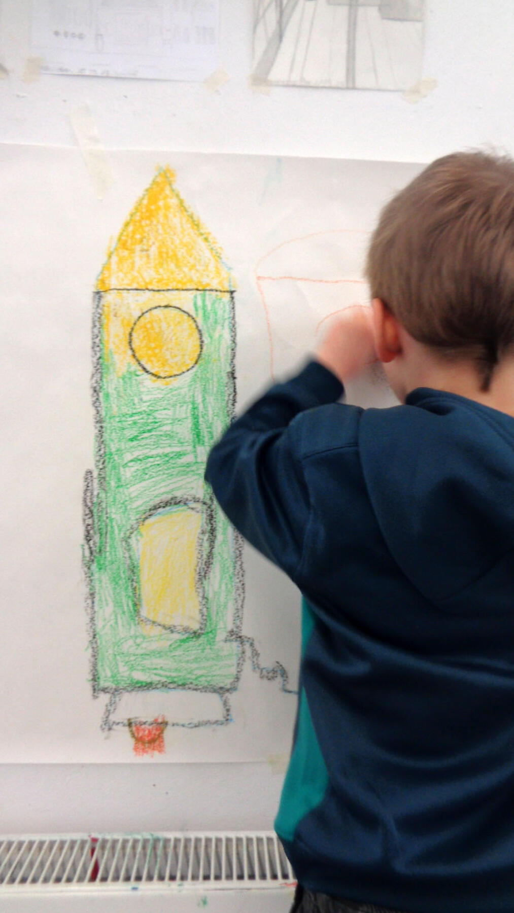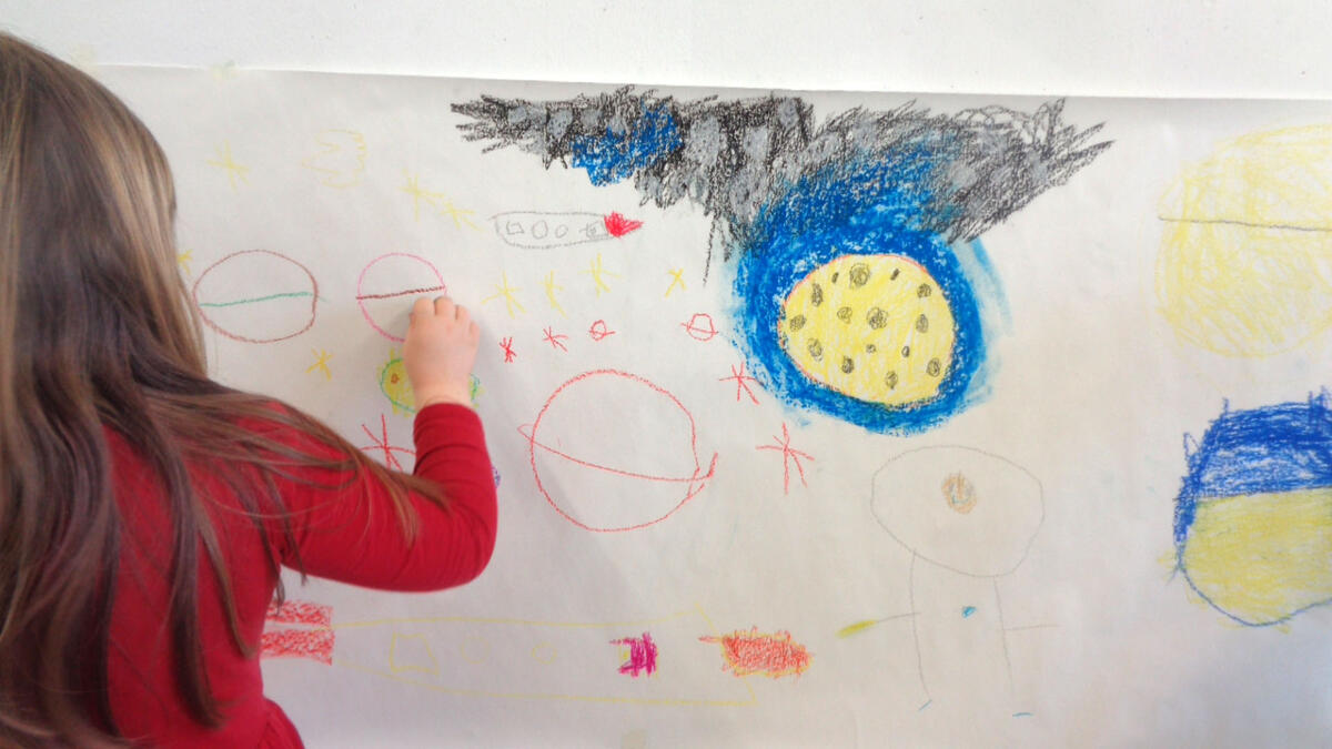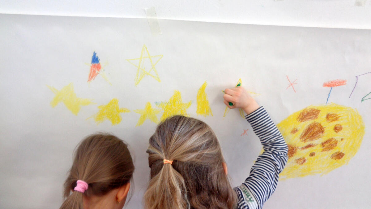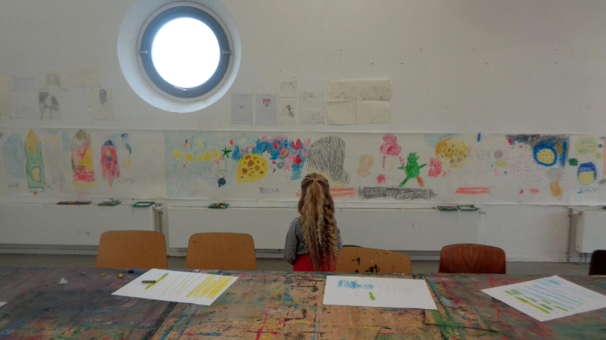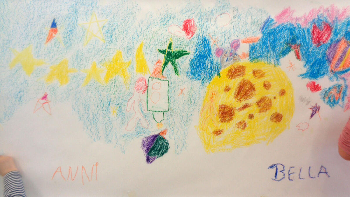 Nach einer kurzen Vorstellungsrunde probierten die Kinder die Einsatzmöglichkeiten der Ölpastellkreide aus. Es wurden Linien, Flächen, Farbmischungen ausprobiert und festgestellt, dass man auch mit den Fingern Farben verstreichen kann. Nachdem das Hörspiel „Die Maus im Mond“ von Autor Sebastian Loth zweimal gehört wurde, die Hauptcharaktere die verschiedenen Orte und andere Besonderheiten geklärt wurden, ging es nun an die Wand. Die Kinder stellten sich entsprechend der gewählten Szenen mit ausgebreiteten Armen in einer Kette an die Wand. Die Papierrolle wurde an der Wand ausgebreitet und über zehn Meter Zeichenfläche wurden mit Klebeband an der Wand fixiert. Frieda und Sophia gestalteten den Beginn der Geschichte- als die kleine Maus in ihrem Bettchen lag und davon träumte in den Käsemond reinbeißen zu können. Erik und Ben zeichneten das Raketengelände, zu dem die Maus lief um mit zwei Astronauten zum Mond zu fliegen. Bella und Anni gestalteten den Mond mit der Maus, den Astronauten, der Fahne und das umliegende Weltall. Anni hat sich dabei auf das Zeichnen von Sternen spezialisiert. An dieser Stelle der Geschichte machte die Maus die traurige Entdeckung, dass der Mond nicht aus Käse, sondern aus Stein besteht. Ben interessierte für die Astronauten und zeichnete diese großformatig über ihrer Rakete. Den Rückflug der Rakete durch die gesamte Galaxie illustrierte Josie. Zu guter Letzt schlief die kleine Maus zufrieden in ihrem Mäusebettchen wieder ein. Dieser Szene nahm sich Liam an. Witzigerweise hatte die Maus ein Bild von Liam, der gerade Eis isst bei sich zu Hause zu hängen.