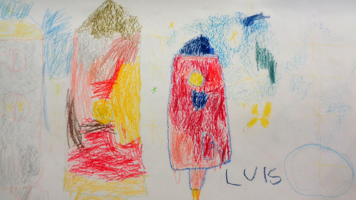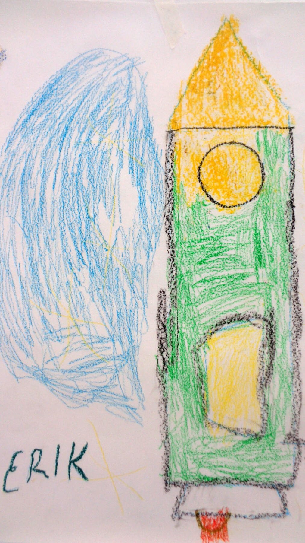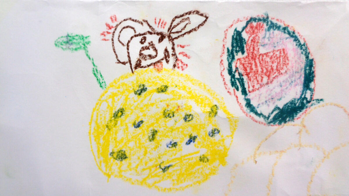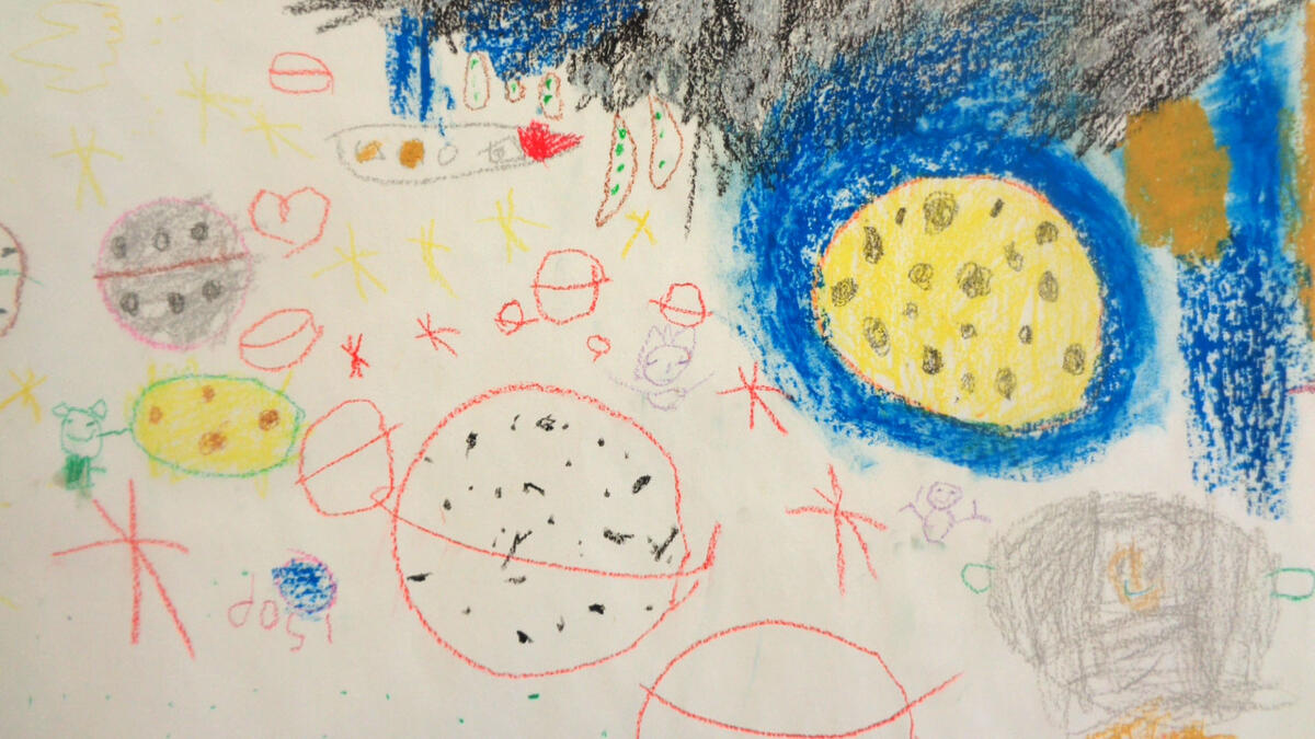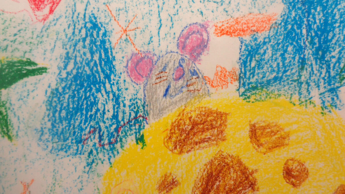 Nach einer kurzen Vorstellungsrunde probierten die Kinder die Einsatzmöglichkeiten der Ölpastellkreide aus. Es wurden Linien, Flächen, Farbmischungen ausprobiert und festgestellt, dass man auch mit den Fingern Farben verstreichen kann. Nachdem das Hörspiel „Die Maus im Mond“ von Autor Sebastian Loth zweimal gehört wurde, die Hauptcharaktere die verschiedenen Orte und andere Besonderheiten geklärt wurden, ging es nun an die Wand. Die Kinder stellten sich entsprechend der gewählten Szenen mit ausgebreiteten Armen in einer Kette an die Wand. Die Papierrolle wurde an der Wand ausgebreitet und über zehn Meter Zeichenfläche wurden mit Klebeband an der Wand fixiert. Frieda und Sophia gestalteten den Beginn der Geschichte- als die kleine Maus in ihrem Bettchen lag und davon träumte in den Käsemond reinbeißen zu können. Erik und Ben zeichneten das Raketengelände, zu dem die Maus lief um mit zwei Astronauten zum Mond zu fliegen. Bella und Anni gestalteten den Mond mit der Maus, den Astronauten, der Fahne und das umliegende Weltall. Anni hat sich dabei auf das Zeichnen von Sternen spezialisiert. An dieser Stelle der Geschichte machte die Maus die traurige Entdeckung, dass der Mond nicht aus Käse, sondern aus Stein besteht. Ben interessierte für die Astronauten und zeichnete diese großformatig über ihrer Rakete. Den Rückflug der Rakete durch die gesamte Galaxie illustrierte Josie. Zu guter Letzt schlief die kleine Maus zufrieden in ihrem Mäusebettchen wieder ein. Dieser Szene nahm sich Liam an. Witzigerweise hatte die Maus ein Bild von Liam, der gerade Eis isst bei sich zu Hause zu hängen.